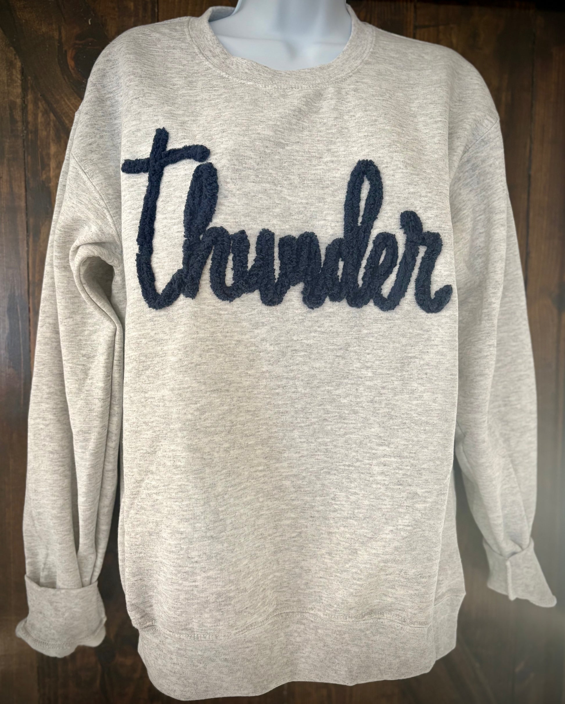 This custom Thunder crewneck is simply irresistible! The word "Thunder" is beautifully stitched in soft yarn, making it a standout piece. It’s the perfect way to show your support and cheer on your Zimmerman Thunder with style and comfort! Don’t miss out on adding this amazing crewneck to your wardrobe! Navy Crewneck with light blue yarn stitched on. Heavy blend sweatshirt.